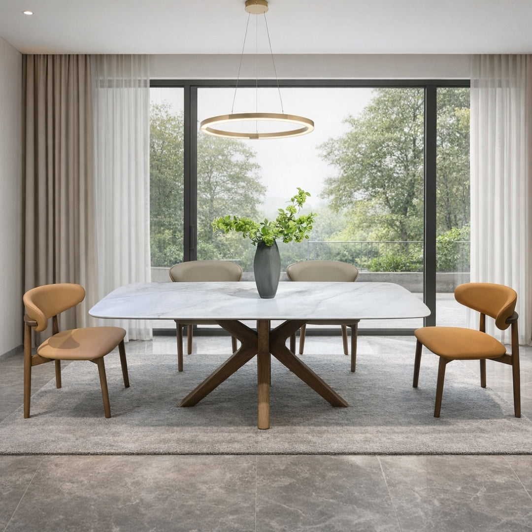 Phần chân bàn được chế tác từ gỗ chất lượng cao, đóng vai trò là điểm nhấn quan trọng trong tổng thể thiết kế. Dáng chân được tạo hình tỏa trục, đặt cân xứng bên dưới mặt bàn, vừa đảm bảo khả năng chịu lực và độ ổn định khi sử dụng, vừa tạo hiệu ứng thị giác hài hòa và thanh thoát. Các đường nét bo tròn nhẹ giúp giảm cảm giác thô cứng, mang lại sự mềm mại và tinh tế cho không gian phòng ăn.