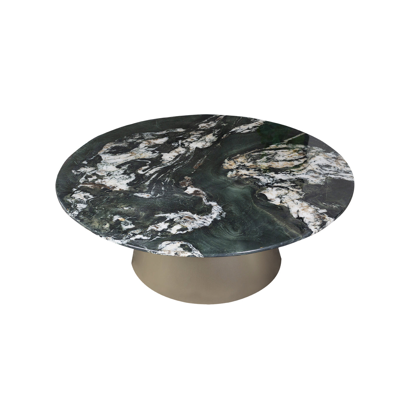 Mặt bàn cafe Asta A được làm từ đá Marble với hoa văn Mica Green sang trọng, kết hợp chất liệu đá Marble tự nhiên nguyên khối và lớp tráng bóng được phủ thêm để chống thấm cho đá và tạo được độ bóng cho bề mặt, đồng thời giúp mặt đá dễ lau chùi vệ sinh.
