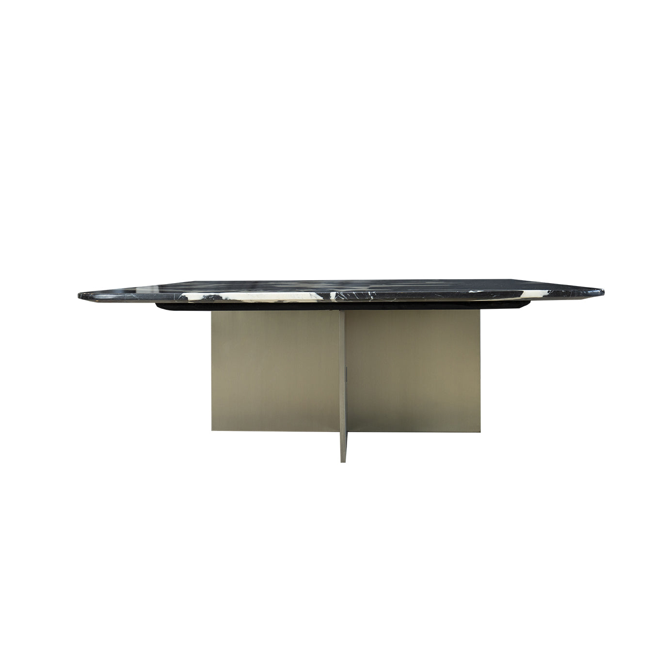 Mặt bàn được làm từ đá Marble với hoa văn Bulgari Black sang trọng, kết hợp chất liệu đá Marble tự nhiên nguyên khối và lớp tráng bóng được phủ thêm để chống thấm cho đá và tạo được độ bóng cho bề mặt, đồng thời giúp mặt đá dễ lau chùi vệ sinh.